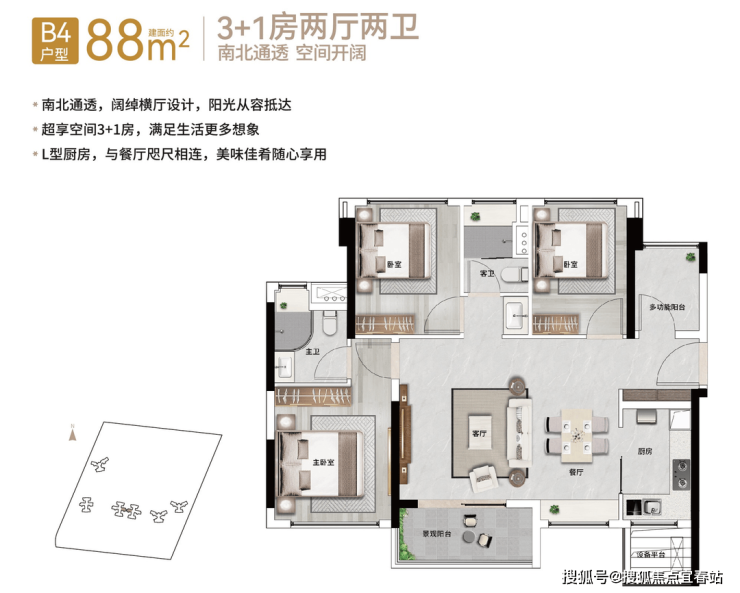 【88㎡3+1房2厅2卫】经典竖厅格局,三开间采光,近11㎡主卧套房设计,优享生活逸趣,稀缺小户型,低总价晋阶天河