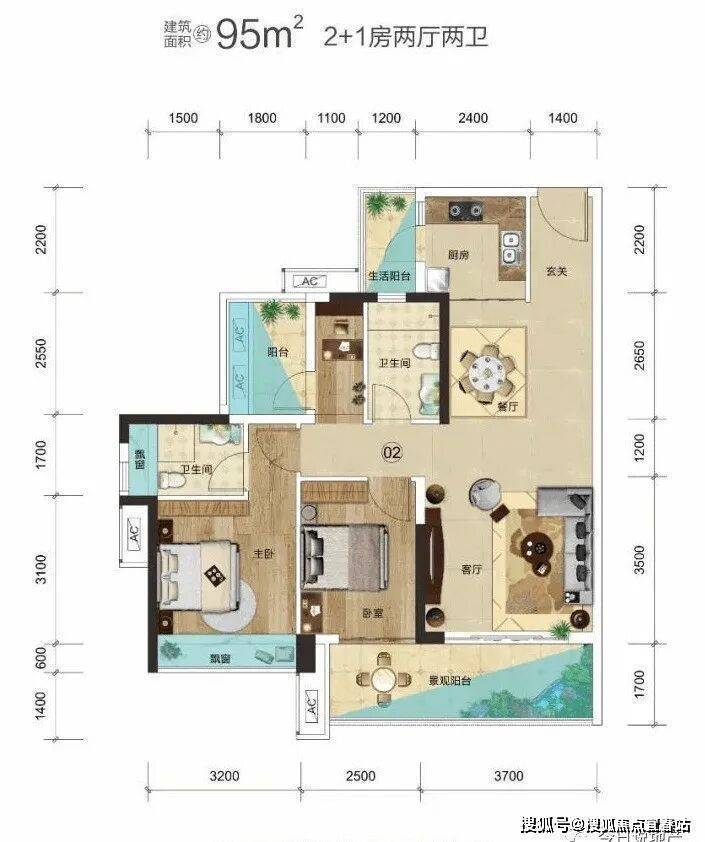 建面约95㎡3房户型的亮点:户户朝南,动静分区,约6.2米大阳台,270°景观房;科学3房布局,户户朝南,6.2米瞰景大阳台;主卧舒适套间+270°景观房,超舒适享受。