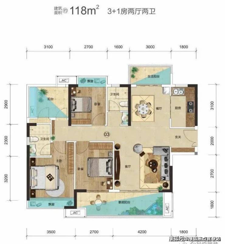 建面约118㎡4房户型的亮点:约6.9米大阳台、主卧套间、270°景观房;奢阔4房设计,南北对流双阳台设计,朝南6.9米大景观阳台瞰景;主卧舒适套间+270°景