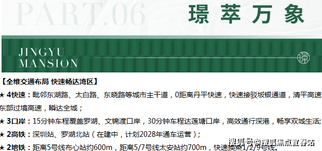 在交通出行方面,京基璟誉府距离5号线布心站约600米、5/7号线太安站约700米,步行约8-12分钟即可进站,属于“双地铁”物业;0距离接驳丹平快速,快速连接坂银通道、清平高速、东部过境高速,约15分钟车程可达罗湖、文锦渡口岸,约30分钟车程达莲塘口岸,高效通行深港。克而瑞测评显示,项目交通便利度评分高达8.7分,在竞品组中高居第1名。