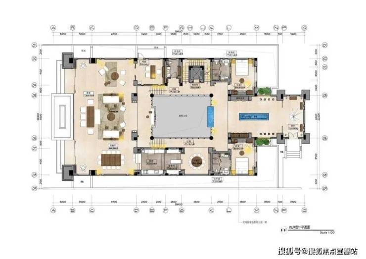 C1户型:建筑面积699㎡使用面积2200㎡,毛坯,售价1.32亿-1.6亿左右。
