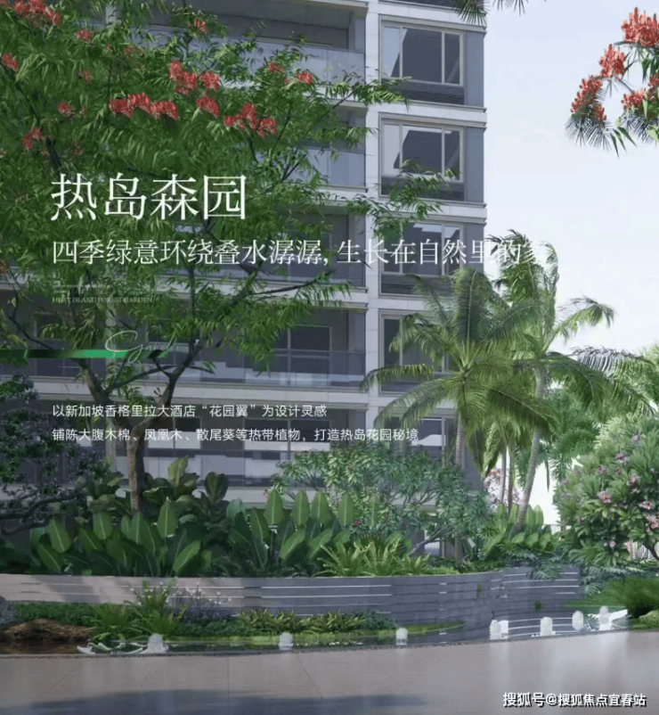 ✅铺陈大腹木棉、凤凰木、散尾葵🌿等热带植物,营造热岛花园秘境
