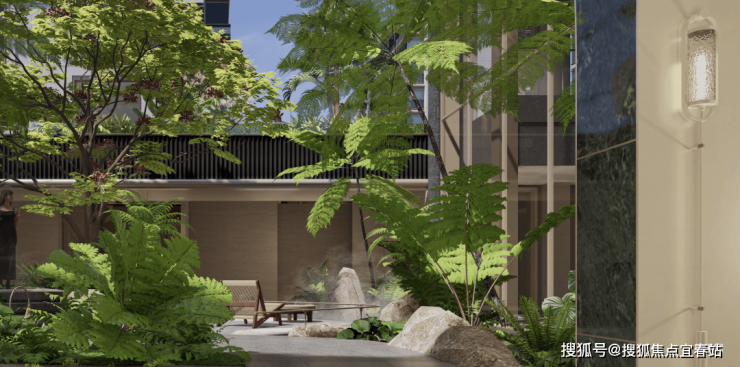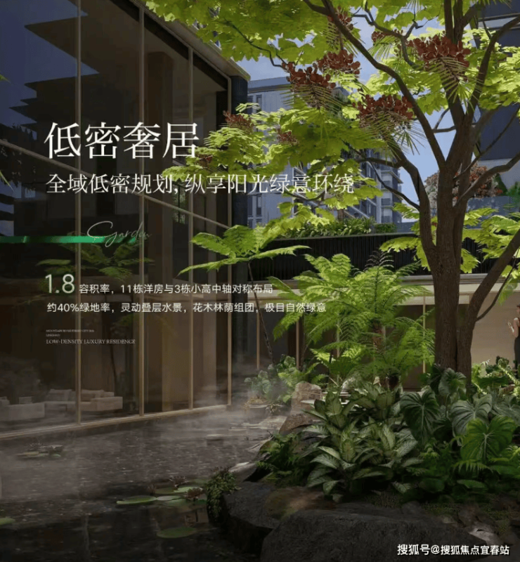 「云栖里」组团整体容积率约1.8,由11栋洋房与3栋小高层呈中轴对称布局,约40%绿地率与叠水景观、热带植被交织,营造沉浸式森居体验。