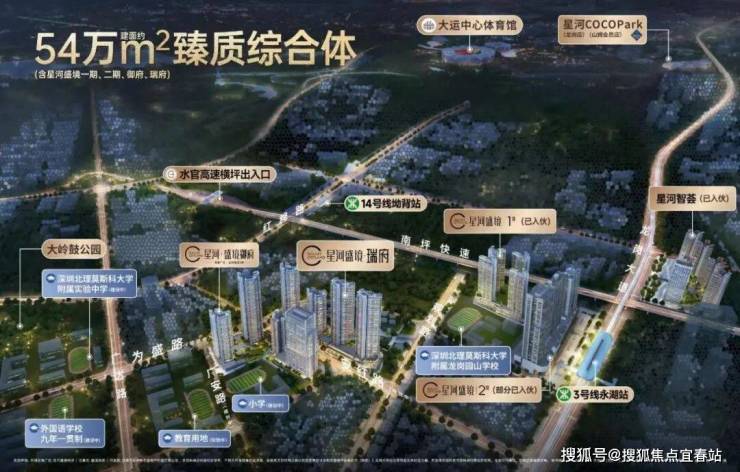 作为星河集团打造的约54万平方米超级综合体的一部分,星河盛境瑞府自身规划了集住宅、商业、公寓、办公于一体的多元业态,致力于为业主构建一个自成一体的繁华生活圈。