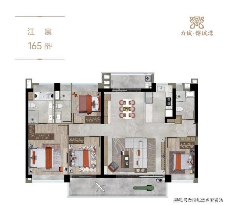 建面约165㎡的四房户型,打造南北双阳台,南向四开间望江。