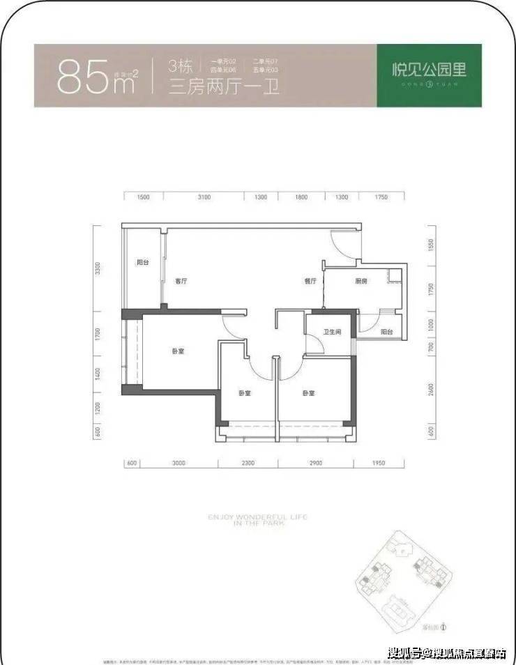 95㎡的3房2厅2卫,仅3栋1单元01户型,设计的是竖厅双龙抱珠格局,客厅3.4米开间,三开间朝南,3个卧室分别做到了3.2米/2.8米/2.3米的宽度,L型厨房带1个生活阳台,公卫三段式分离,得房率73.71%(不含赠送),西南朝向。