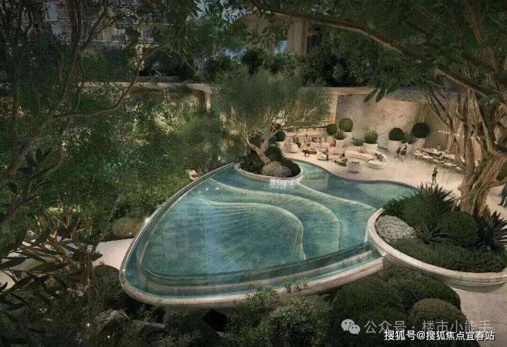 小区花园效果图:花园分为屋面和下沉两部分,利用场地高差将商务洽谈、瑜伽静修、恒温畅泳等五大会所空间环绕中心庭院叠落。