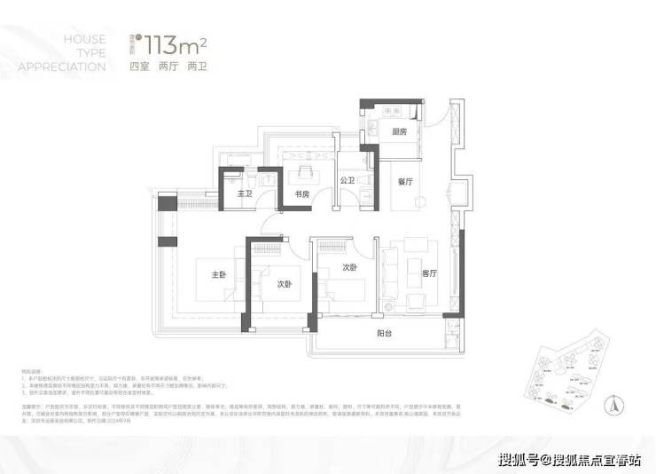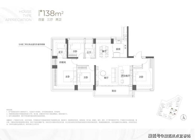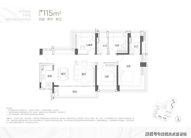 竖庭格局,西南向,基本居住功能与建面约108-110㎡4房2卫一致,但格局不一样,从目前公布的户型图上看,主要是主卧空间有了更大的提升,比如可以放更大一点的衣柜。