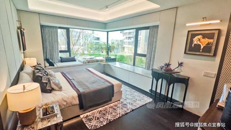 主卧是一个大套间,配有独立卫浴,随时能享受私密二人世界。而且同样的带有270°L型大飘窗,躺在床上也能享受“环幕美景”。