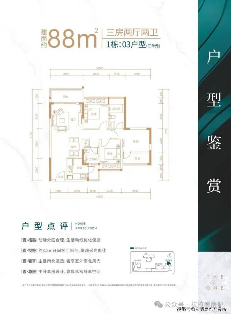 88-89㎡3房2厅2卫:动静分区布局,客厅开间大且带有阳台,主卧通透开间进深比良好。南北双次卧空间较为紧凑,居住空间通风效果较好。