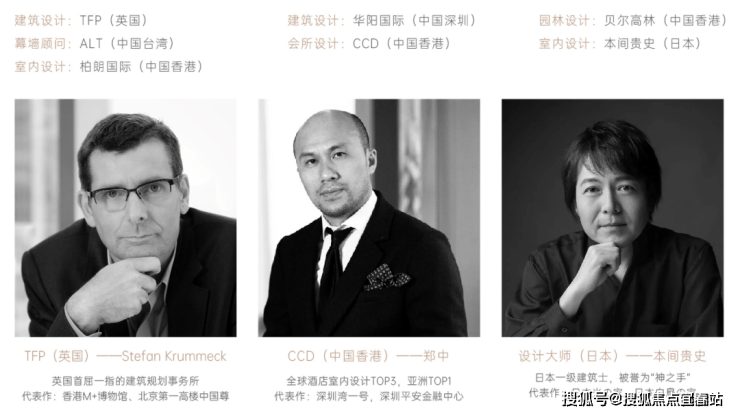 英国首屈一指的建筑规划事务所TFP;打造了 深圳湾1号、深圳平安金融中心的国际大师郑中;日本一级建筑士、被誉为神之手的设计大师本间贵史……
