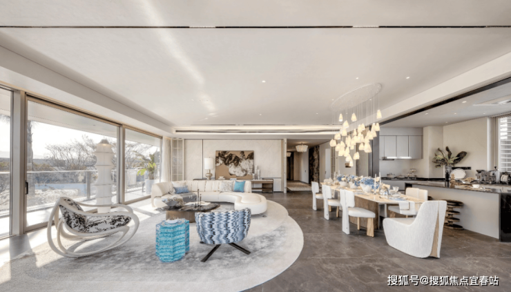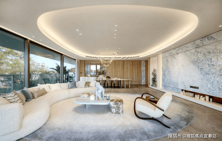 步入室内,就是约10㎡的私享电梯前厅,层高约3.5m,三面采光的公区,270°无柱环形端厅,延伸出约44米的观景面,尽显主人气场。