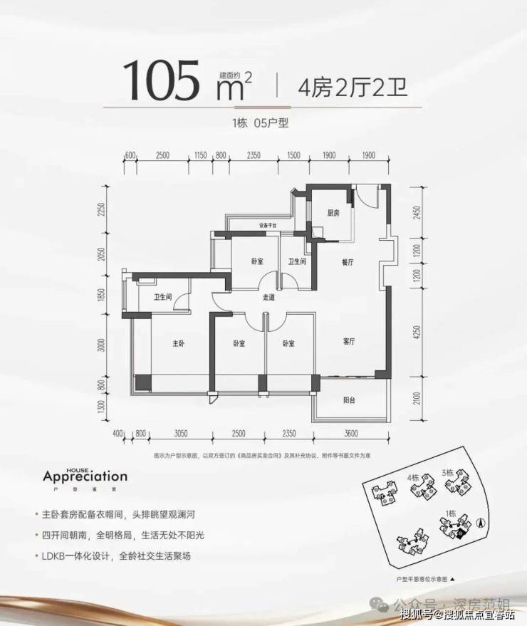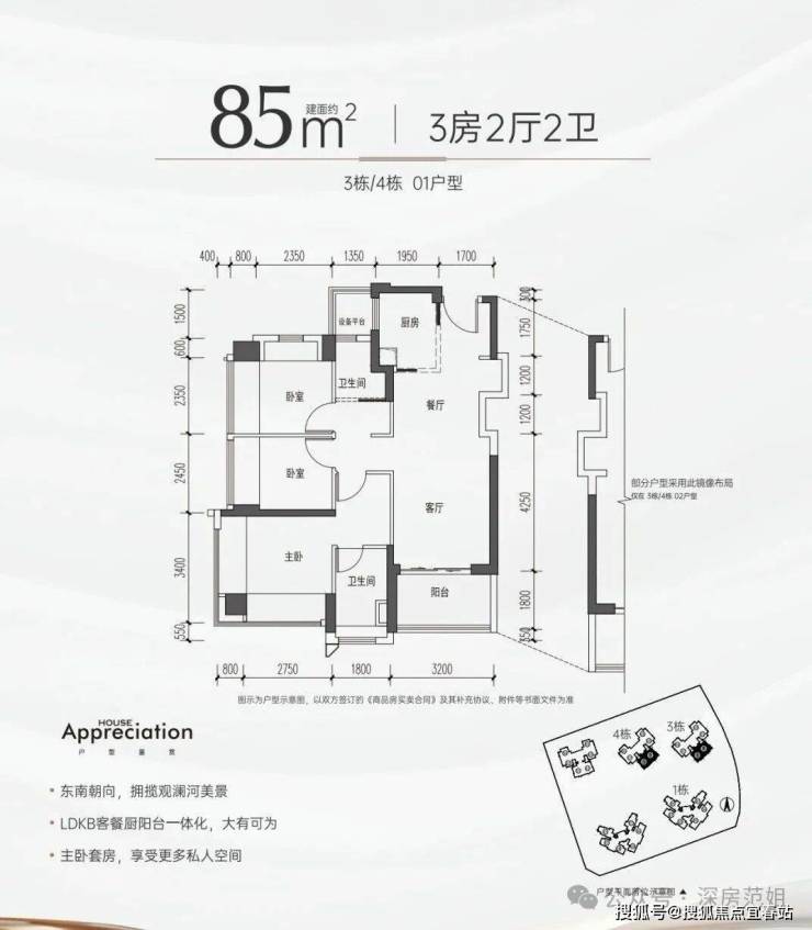 该地块有5栋住宅,全部为新规户型,得房率达到了100%-106%,属于该区域唯一新规产品。本次计划首推1栋总45层/3栋/4栋总43层,共3座楼栋,约780套住宅产品,面积有建面约75㎡3房2卫、80㎡3房2卫、83㎡3房2卫、85㎡3房2卫,3房产品共4款不同户型,另有94㎡4房2卫、105㎡4房2卫,层高43层左右,3梯6户设计。