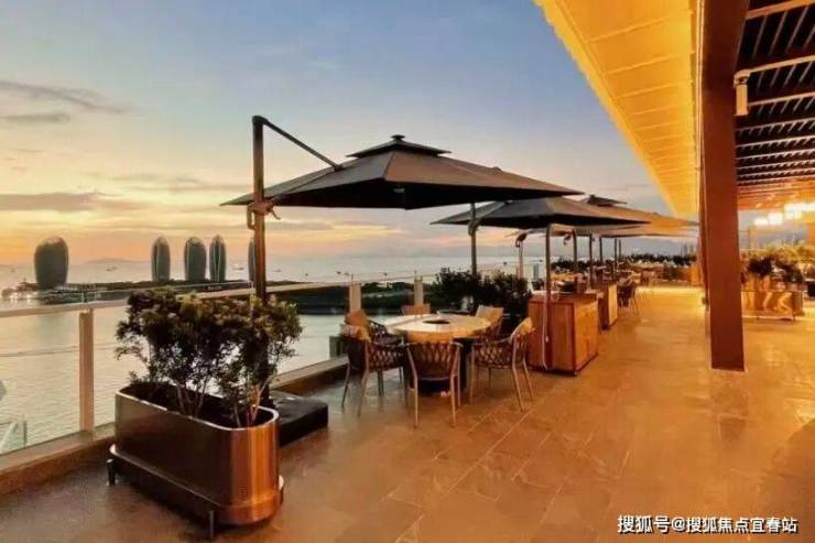 位于高层建筑顶层,可俯瞰三亚湾与凤凰岛观景。配备遮阳伞、户外桌椅与绿植,适配观景用餐、下午茶等。