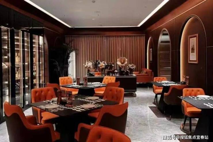 色调以深棕+黑色为主,搭配橙色软包座椅增强质感。配置嵌入式灯光、拱形壁龛、玻璃酒柜,兼具私密性与艺术氛围。