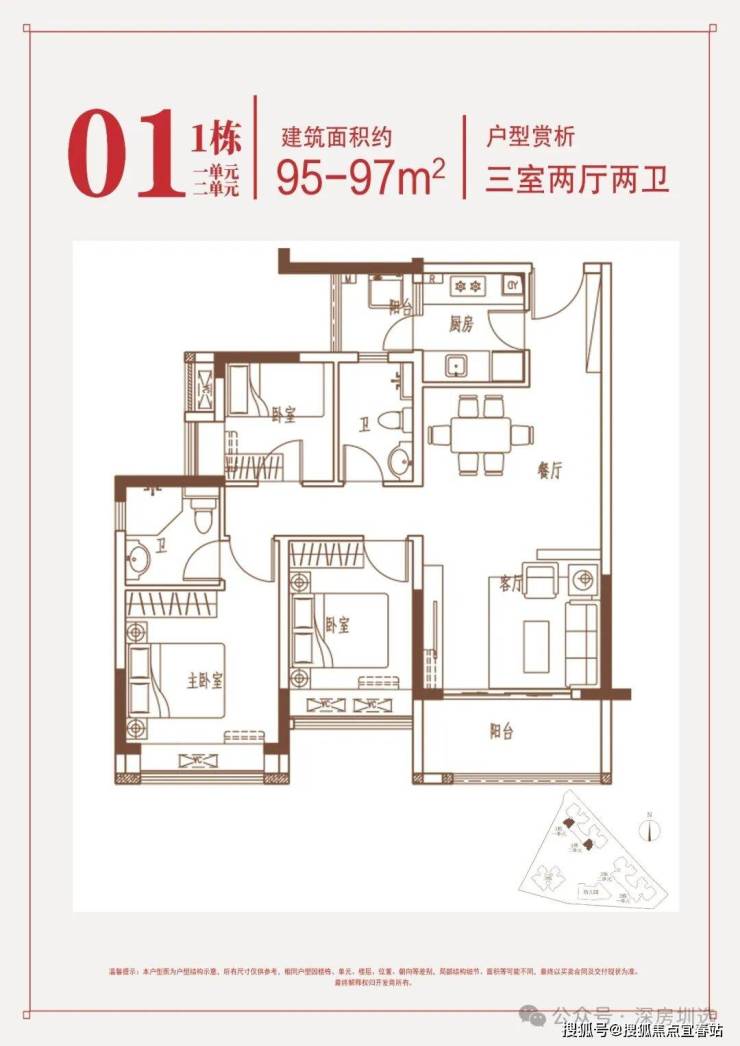 约95-97㎡三房:南向端头位,三面采光,花园瞰景。