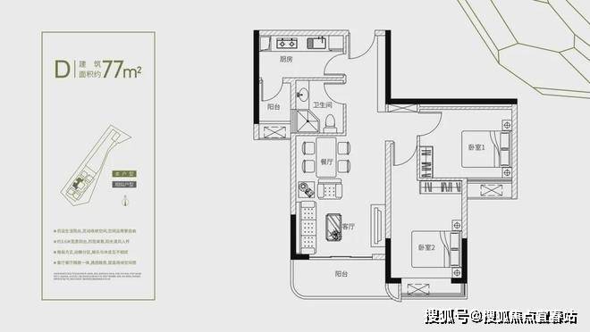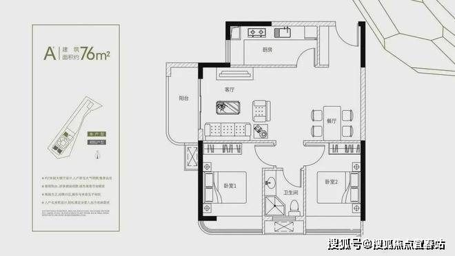 建筑面积约76-78㎡2房+1卫(灵活多变+1多功能空间)
