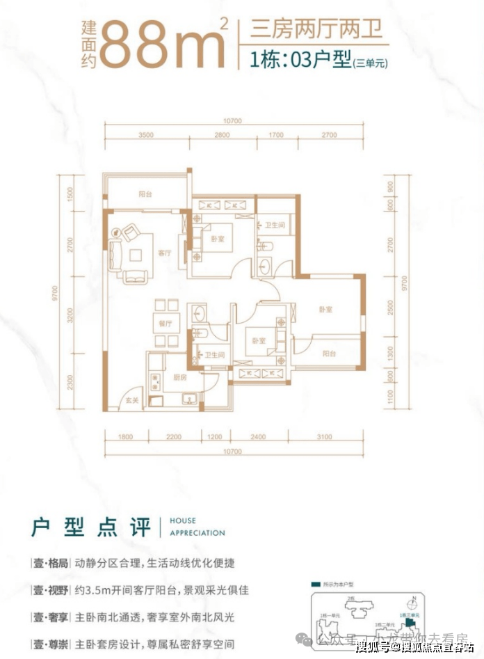 1栋三单元03号房,北向户型,动静分区布局,客厅开间3.5米带有1.5米进深阳台,主卧通透开间进深比良好,空间利用较为充分,南北双次卧,空间较为紧凑。居住空间通风效果较好,拥有良好的视野。
