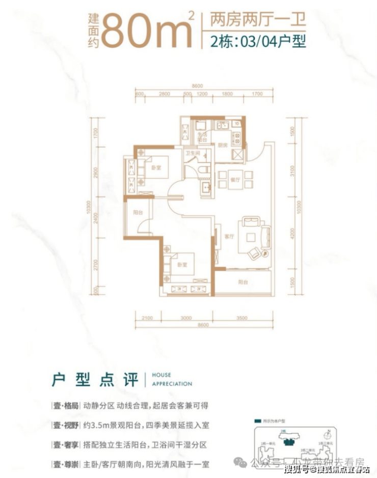 客厅朝南带阳台,主卧朝南,次卧朝西 该户型分布在2栋03,04号房