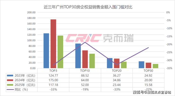在入围门槛上,克而瑞数据监测显示,2025年广州权益金额TOP3梯队房企入围门槛117.18亿元,同比减少33%,TOP10梯队房企入围门槛52亿元,同比减少19%,TOP20梯队房企入围门槛23.44亿元,同比减少33%,TOP30梯队房企入围门槛15.58亿元,同比减少22%。