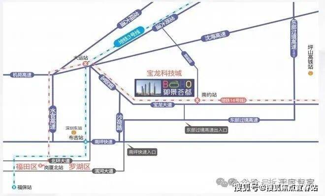 项目直连地铁 14 号线 南约地铁口(规划中 31 号23 号线),2 站大运、9 站福田中心,未来可享四地铁交汇利好;沈海高速和东部过境高速南北贯穿直通罗湖,无缝连接福田、南山;坐享地铁、铁路交通、公交枢纽等多维交通体系,快速通达深圳中心城区、香港及周边城市,高效链接都会生活圈。