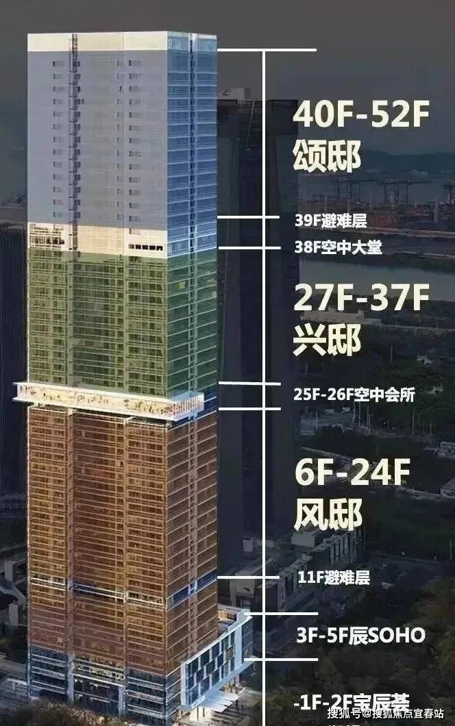 华侨城宝辰总高230米,为宝中最高楼;项目52层,分为中区、高区、超高区,6层起卖,11、39F为避难层,25-26F为空中会所,28F为空中大堂。除了空中大堂项目还有地下入库大堂+首层大堂,一共三重大堂。