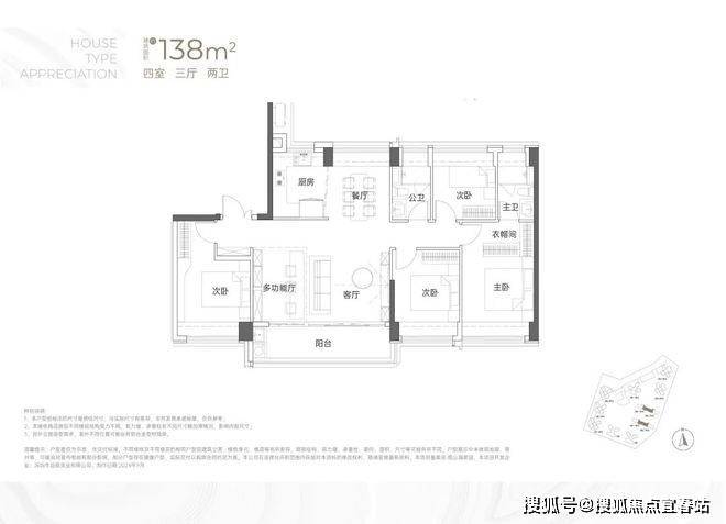 该户型为西南向或东南向,竖庭设计,南北通透,阳台也是连通到次卧对出,比较宽敞。户型动线也比较清晰,动静分区合理,特别是两个卫生间紧靠在一块。