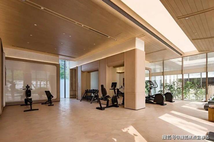 健身区选用“健身界的劳斯莱斯”泰诺健设备,搭配大面积落地窗与室内木饰面,营造出专业又松弛的运动氛围,兼顾有氧与力量训练需求。
