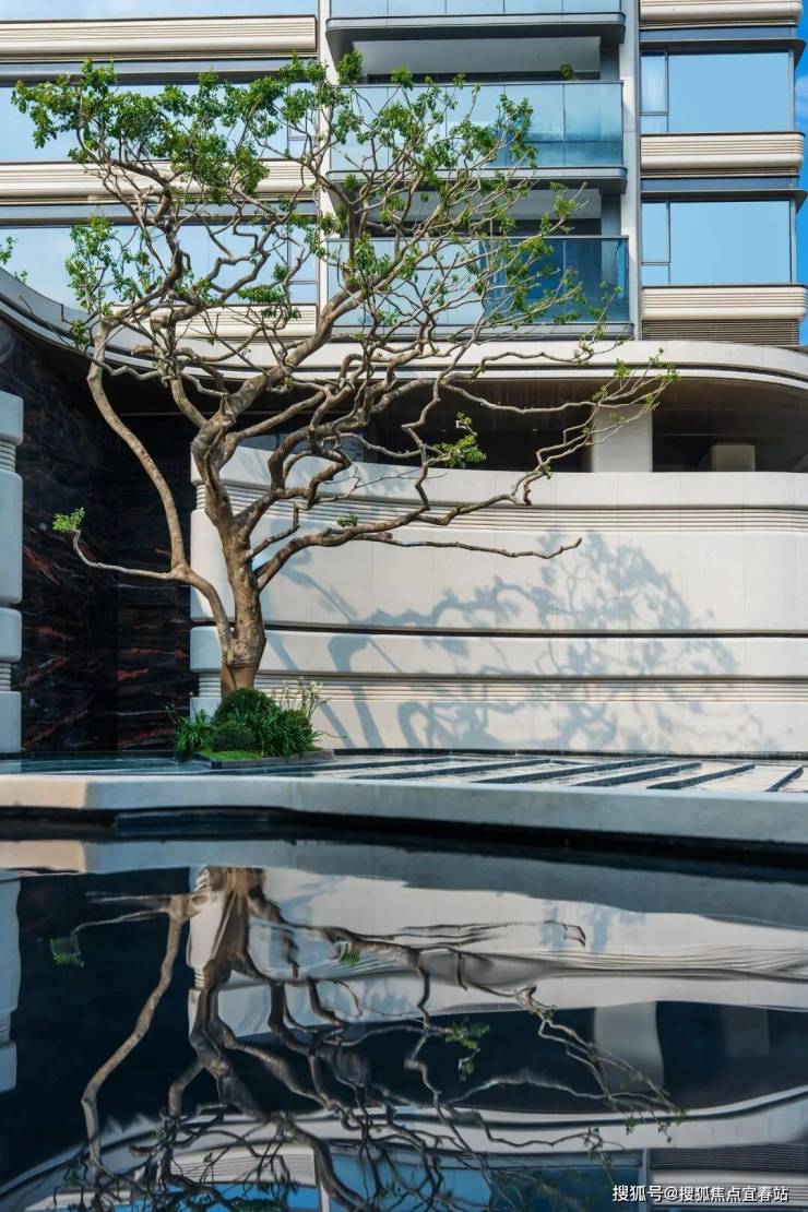 最吸睛的,是树龄近百年的铁冬青,搭配海浪灰花岗石水景,蕴含美好寓意,又拥有海洋森林般的典雅自然气质。