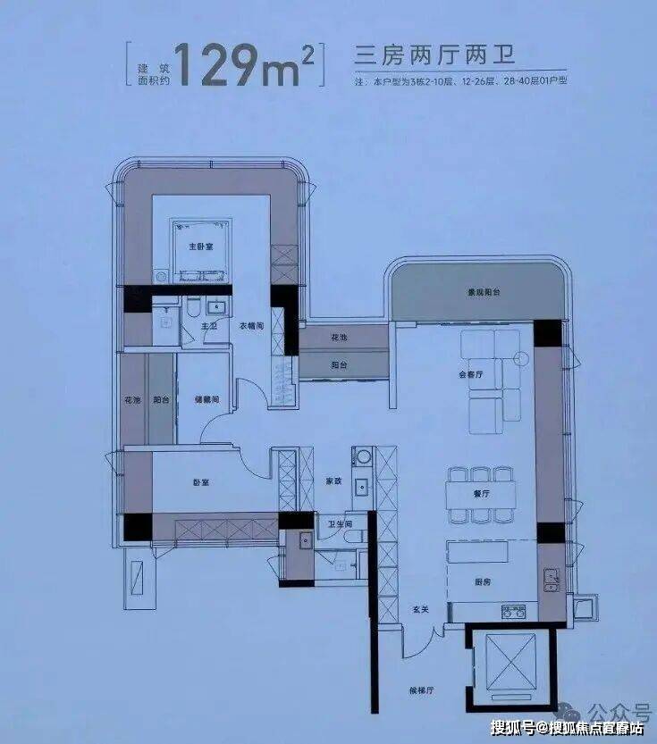 建面约129㎡户型,得房率约105%(包含赠送),东北朝向看一线梧桐山景观。跟127㎡户型只差了2㎡,格局却千差万别。