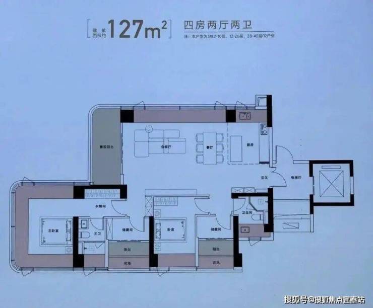 梯户配比:低区 4 梯 5 户、高区 4 梯 4 户;约 127㎡及以上户型专梯专户层高设计:约 3.15 米,拓展舒适空间尺度