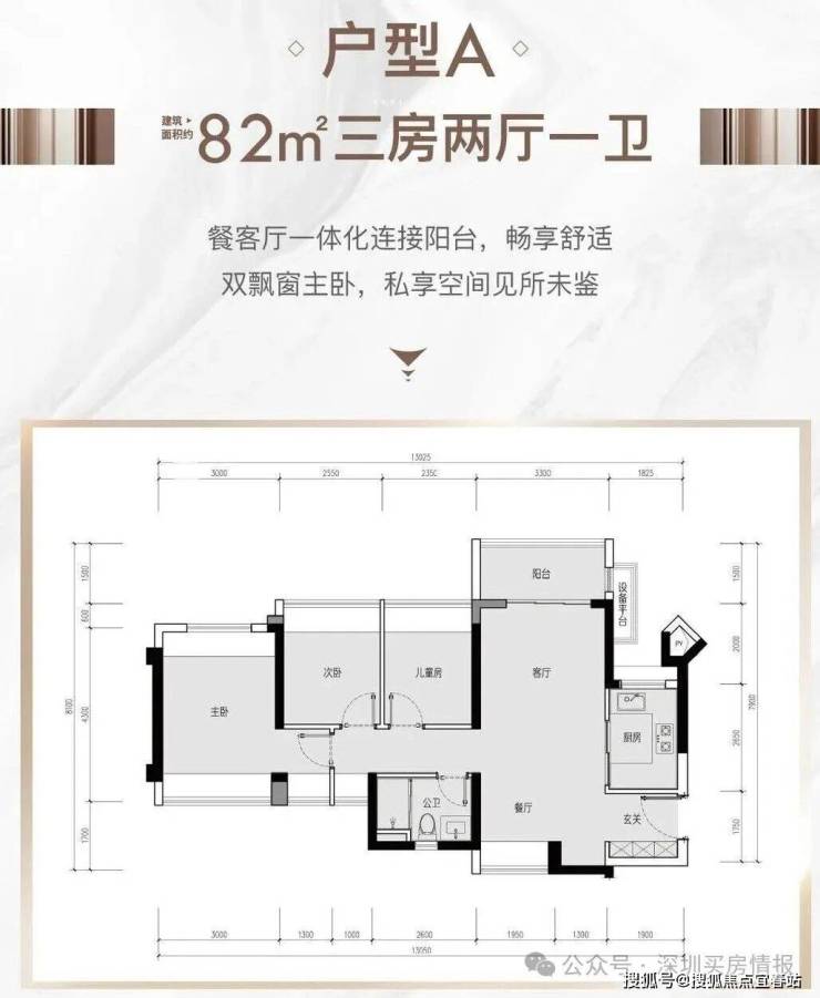 82㎡三房一卫,有通透和竖厅两种户型,均为东北朝向。