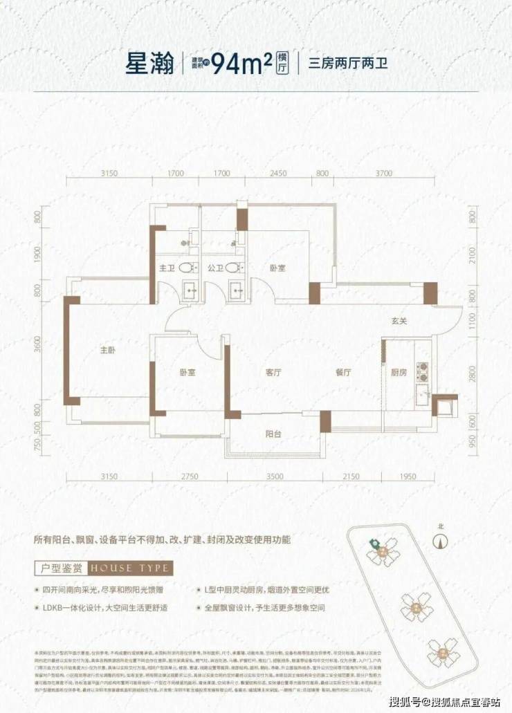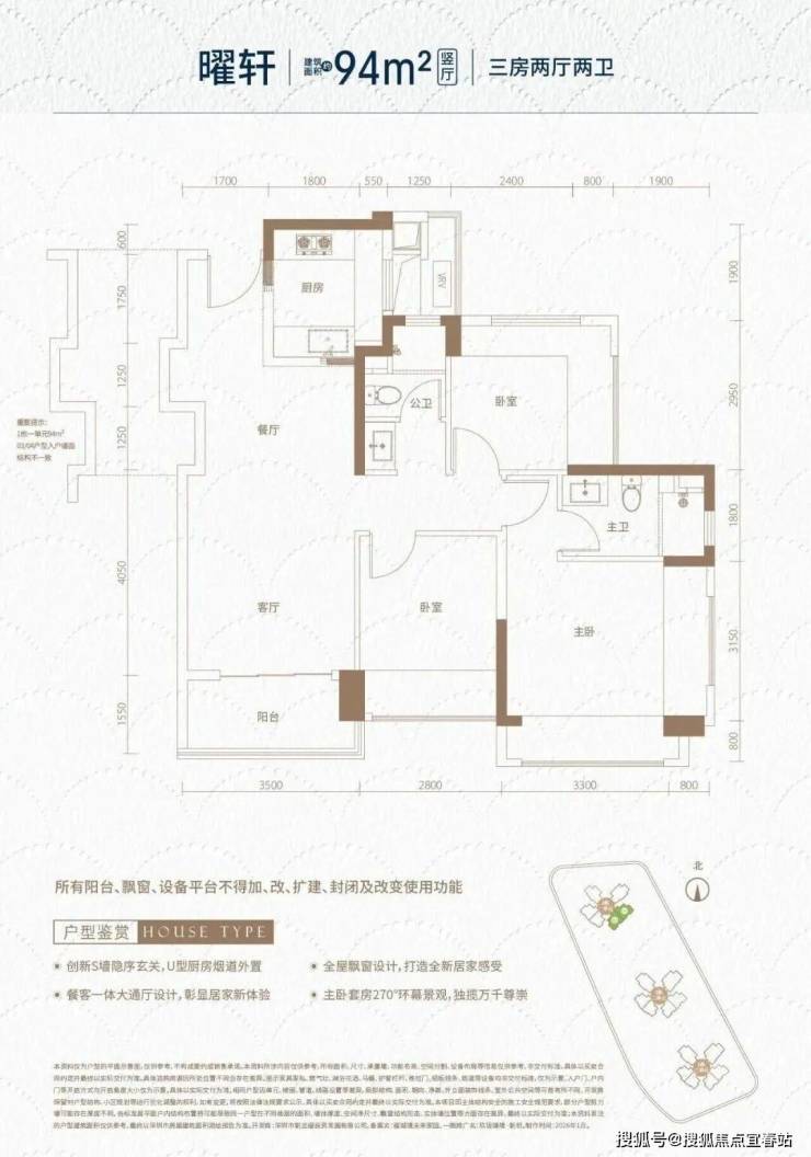 94㎡的3房2厅2卫(-2),设计的是横厅南北通透格局,独门独户,进门入户玄关,客餐厅5.7米开间,LDKB一体化,全屋10面飘窗,主卧南北通,U型厨房,卫生间干湿分离,得房率约93.73%(包含赠送),阳台主朝西南向。