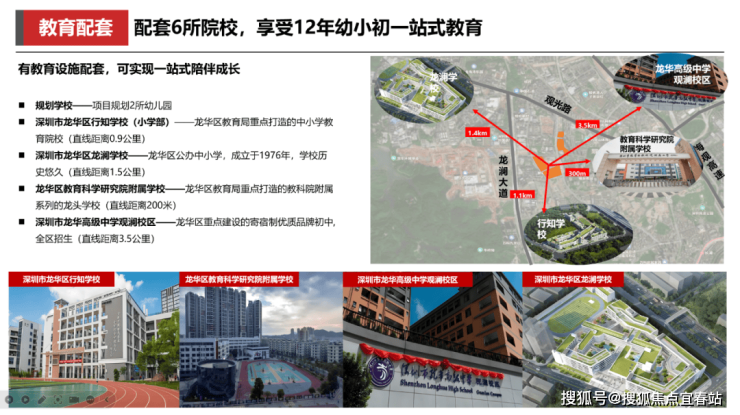 学校配套:项目规划有2所幼儿园,根据2024年龙华区教育局的最新学区划分,小学学区划分在龙华行知学校小学部(距离约1.4公里),福城实验学校小学部(距离约1.7公里),龙澜学校小学部(距离约1.6公里),初中学区划分在龙澜学校初中部。