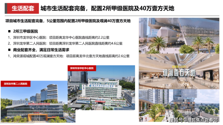 商业配套:项目配建有社区底商,约5公里范围内现有福城天虹购物中心,其内商业品牌众多,在未来还有鸿荣源观城壹方近40万㎡的集中商业,也会是整个观澜的商业标杆,其中包含“壹方天地2.0”(约20万㎡集中商业),对标前海壹方城,规划引入国际一线品牌、特色餐饮及智慧购物体验。