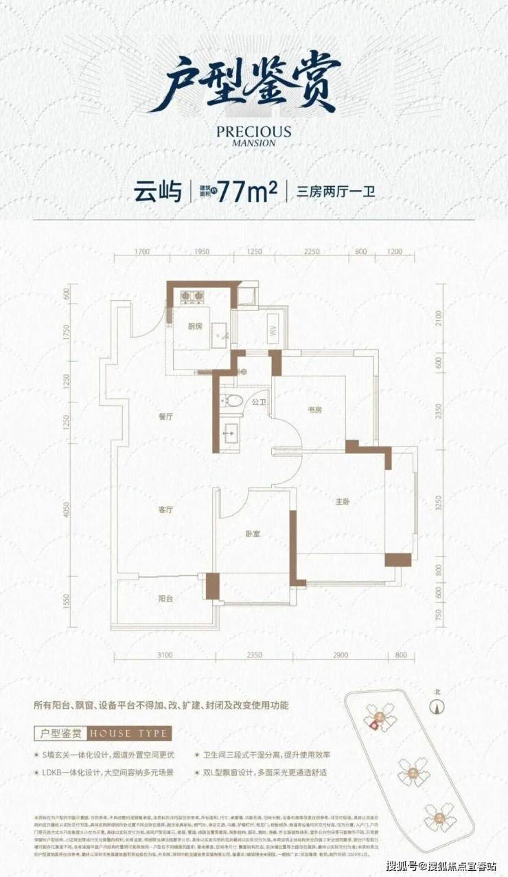 77㎡-3房2厅1卫,设计的是经典竖厅格局,客厅3.3开间,LDKB一体化,S墙设计预留冰箱卡槽位,动静分区,三开间朝南,U型厨房,卫生间三段式分离,还带1个设备平台,得房率约88.34%(包含赠送),西南朝向。