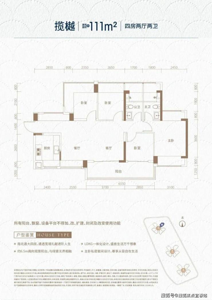 111㎡的4房2厅2卫,设计的是横厅南北通透格局,独门独户,进门入户玄关,客餐厅6.2米开间,LDKB一体化,全屋10面飘窗,主卧南北通,客厅连接次卧出6.8米长的大阳台,U型厨房,卫生间干湿分离,得房率约95.73%(包含赠送),阳台主朝东南向。