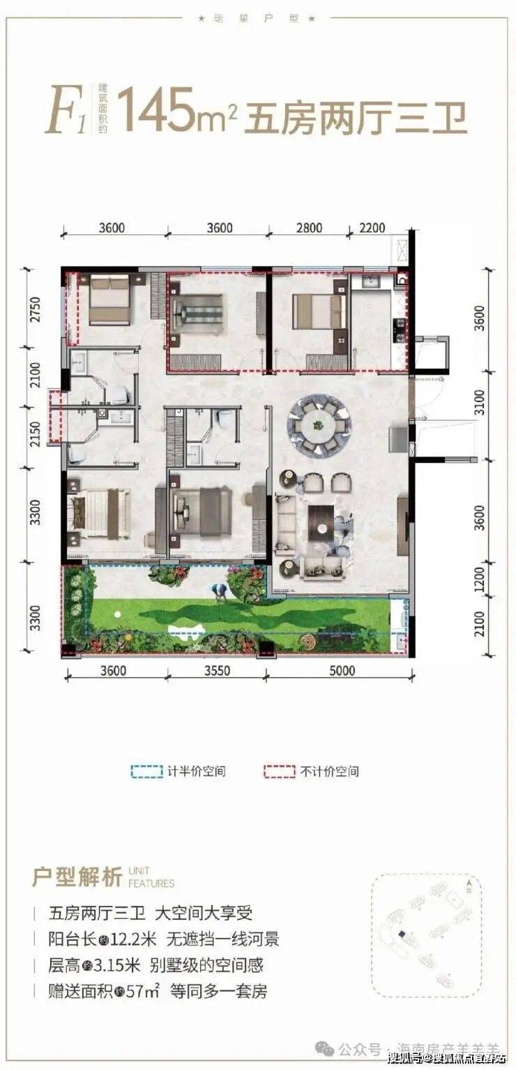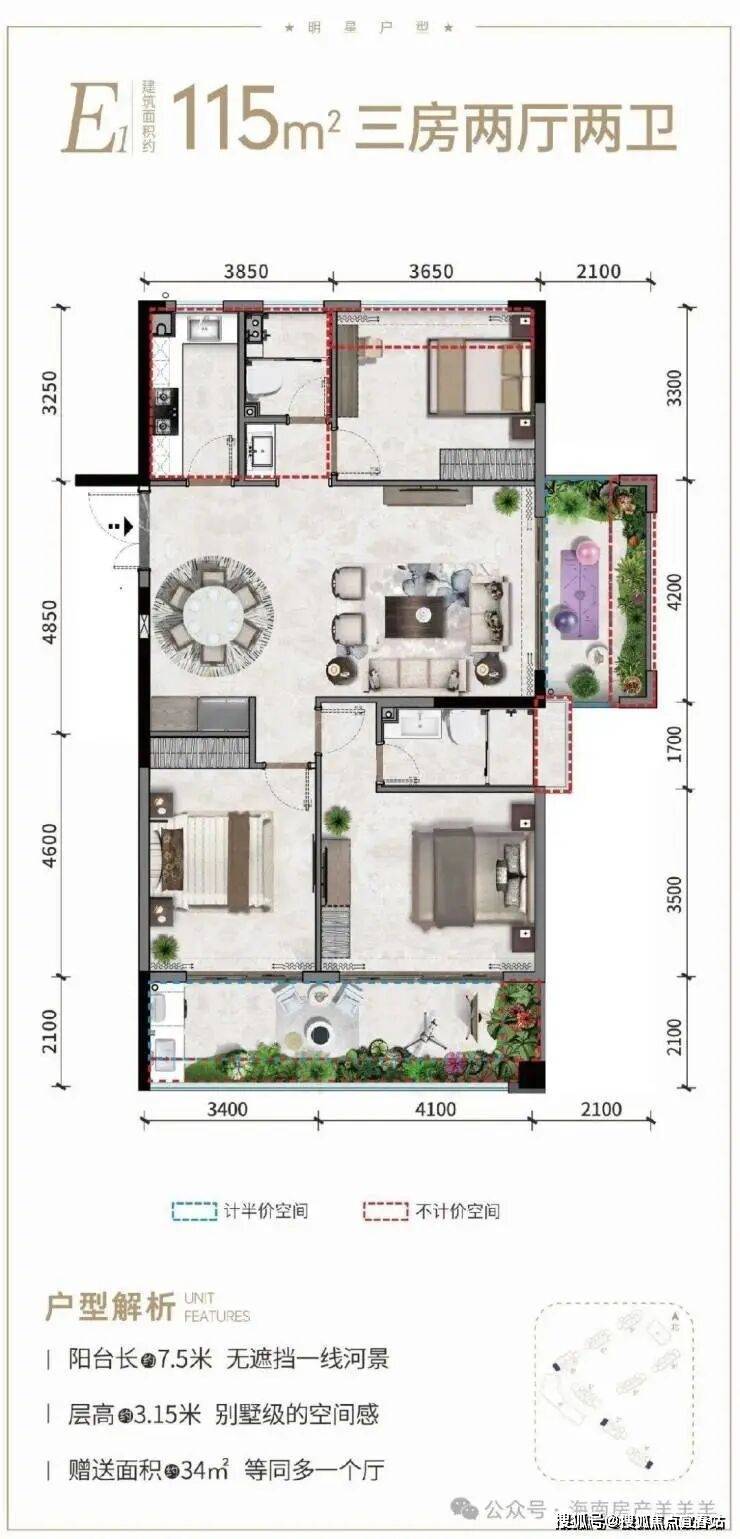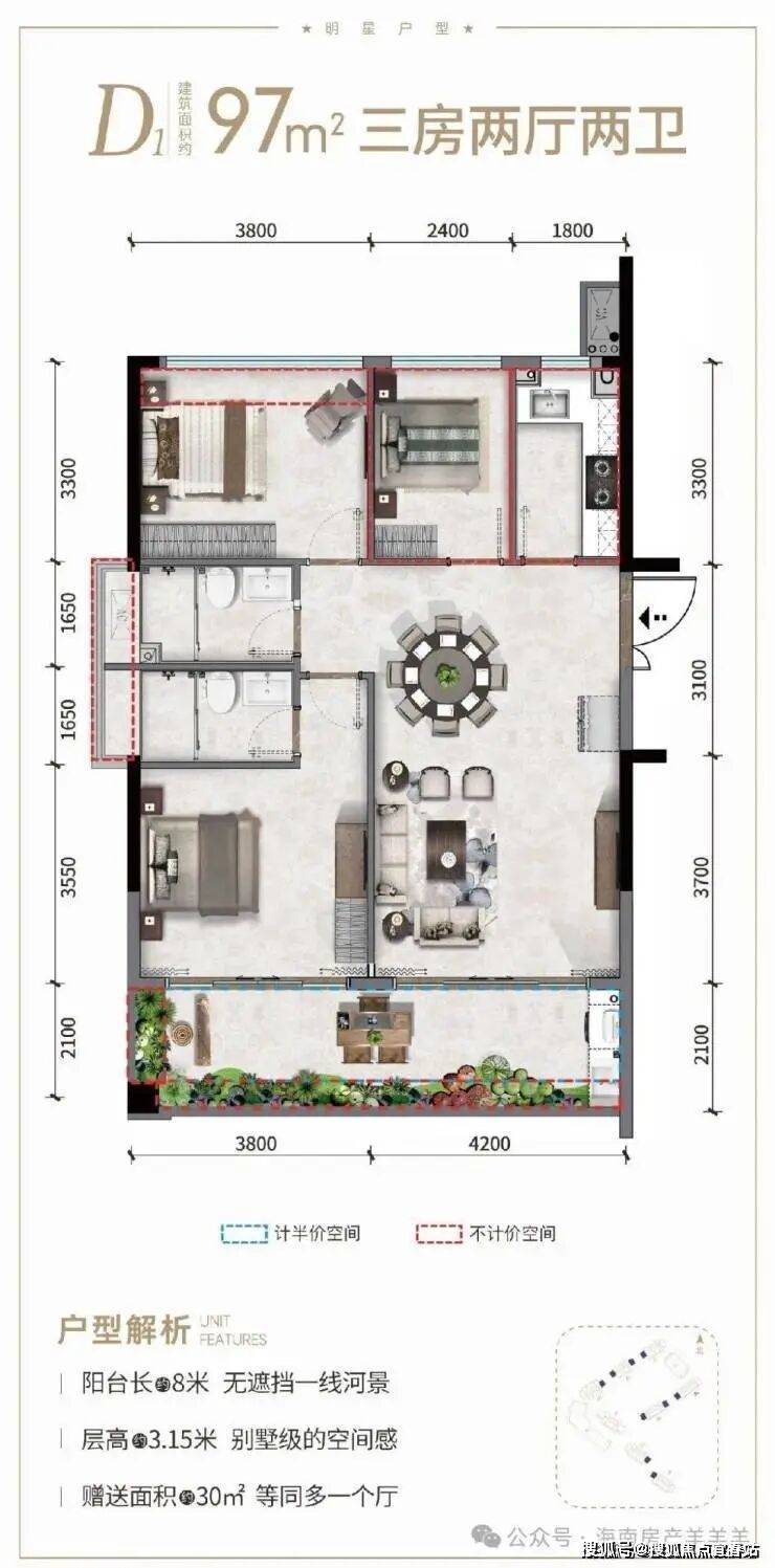 ②产权式酒店,户型南北通透,面积93-145㎡两房至四房。赠送超大面积,93㎡两房一卫、97㎡小三房两卫、115㎡三房两卫、141㎡四房三卫;阳台面宽高达12米,部分阳台可270°三面河景。