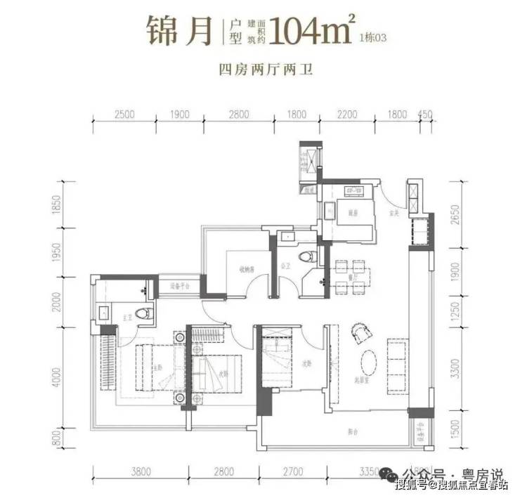 以全明格局联动LDKB一体化方厅与创新S墙巧思,更融入270°环幕主卧,将生活奢享提升至全新境界。• 锦月·建面约104㎡4房2厅2卫:南向四开间,6米阳台引景入室,自此生活融于风景