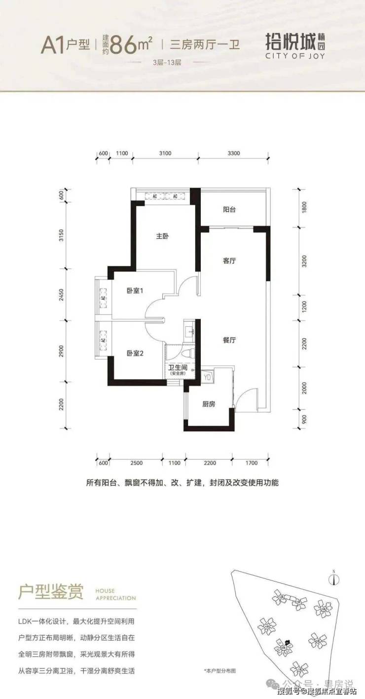 86平三房:设计的是竖厅格局,进门入户玄关,客厅3.3米开间,LDKB一体化设计,3个卧室分别做到了3.1米/2.9米/2.45米的宽度,U型厨房,卫生间三段式分离,得房率:76.92%(不含赠送),阳台1.8米宽度,东北朝向。