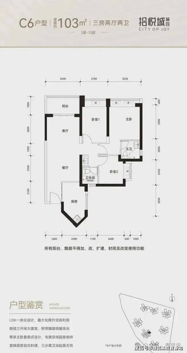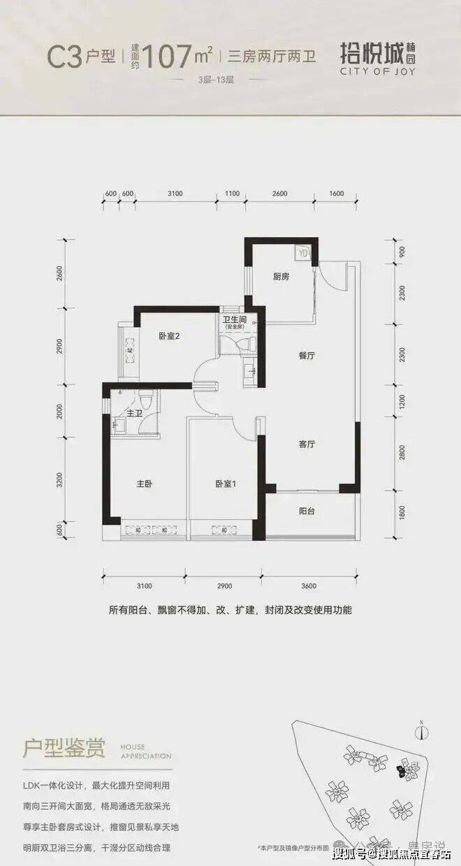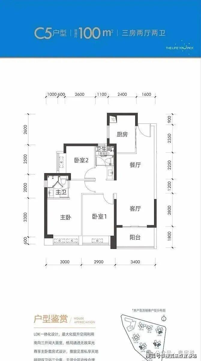 100平三房:设计的是竖厅格局,进门入户玄关,客厅3.4米开间,LDKB一体化设计,3个卧室分别做到了3米/2.9米/2.5米的宽度,U型厨房,公卫三段式分离,得房率:77.14%(不含赠送),阳台1.8米宽度,西南或东南朝向。