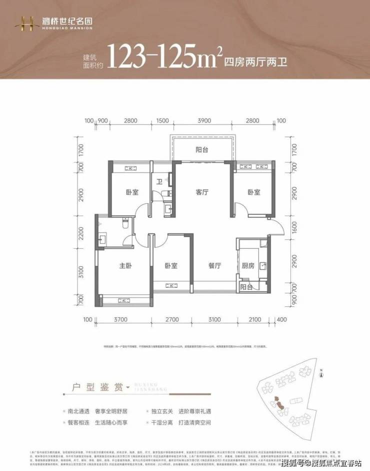 125㎡的4房2厅2卫:竖厅南北通透格局,客厅3.9米开间,LDKB一体化设计,4个卧室分别做到了3.7米/2.8米/2.8米/2.7米的宽度,L型厨房带1个小生活阳台,公卫三段式分离,阳台主朝东北或东南向。