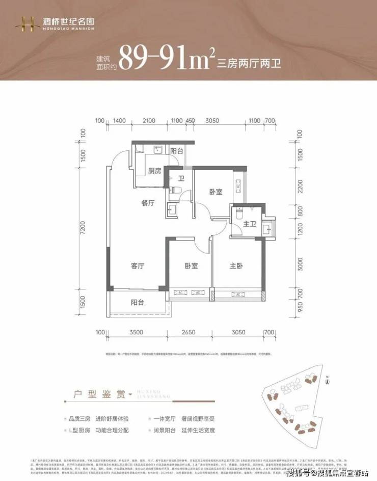 91㎡的3房2厅2卫:竖厅南北通透格局,客厅3.5米开间,LDKB一体化设计,3个卧室分别做到了3.05米/2.6米/2.55米的宽度,L型厨房带1个小生活阳台,卫生间干湿分离,阳台主朝正北向