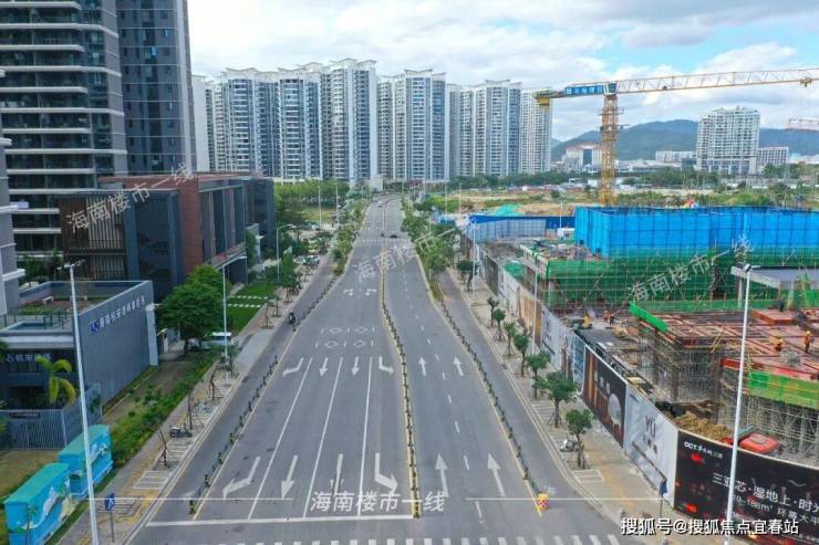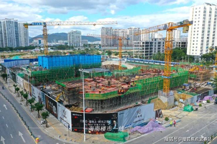 从航拍的视角看,工地内有挖掘机、塔吊机、运输车等在施工,有4栋住宅已冒出地面,1栋地基已打好。