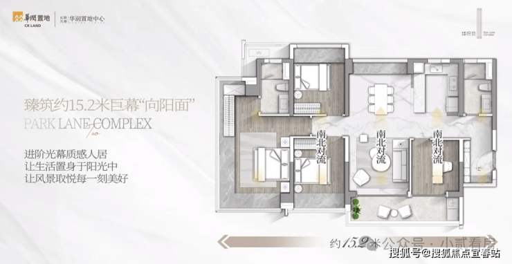 不仅南北对流通透,而且南向采光面去到约15.2米,这基本在140㎡+户型才会有的尺度。