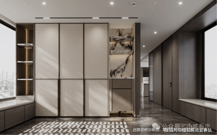 玄关区做了入户缓冲,增加了隐私性和安全性。收纳柜、换鞋区等的设置则增添了实用性。