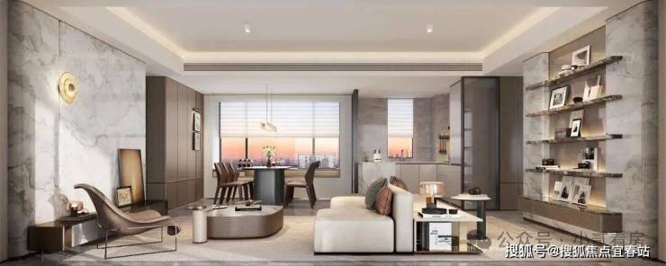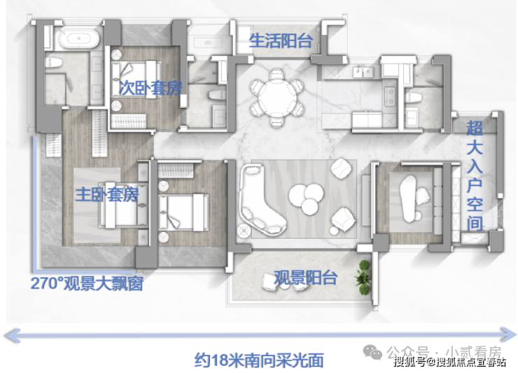 最吸睛的是它的主卧去到28㎡,而且做了约12米长的270°无遮挡U型飘窗,室内光线敞亮,空间通透,非常有豪宅感。