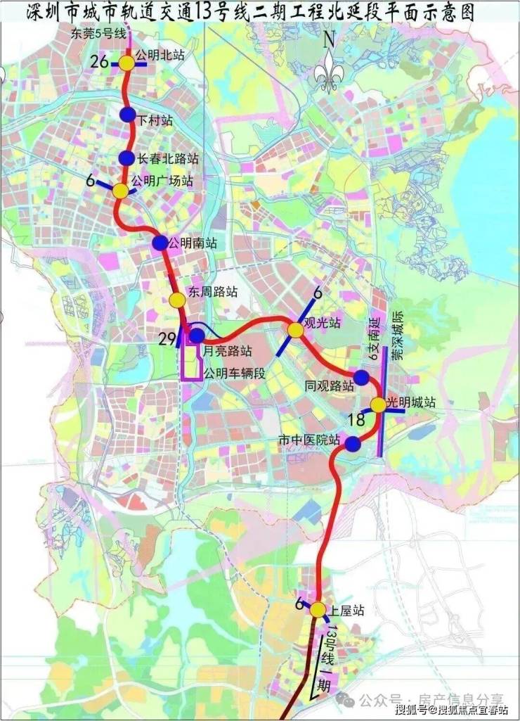 ①13号线及其南、北延长线(建设中,预计2025年开通)起于东角头站,终于公明北站,纵贯光明、宝安、南山,线路开通后约30分钟可抵达南山核心区,约45分钟可达深圳湾口岸,以高新技术人才为主要客流,被称为高新技术人才专线