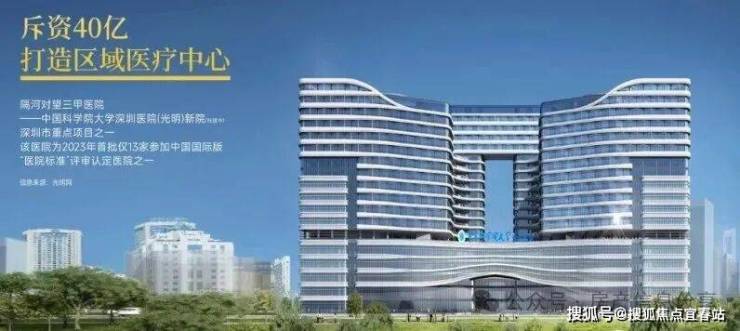 在项目茅洲河对岸,就是“中国科学院大学深圳医院(光明)新院”, 政府 投资 40 亿打造的三甲医院,未来将打造成区域医疗中心,是深圳市重点项目之一,预计2025 年建成并投入使用。项目用地面积约 5 万平方米,总建筑面积为33.7 万平方米,可提供床位 1500 个,将有效缓解群众看病难的问题。
