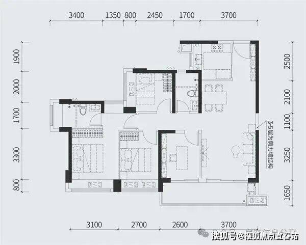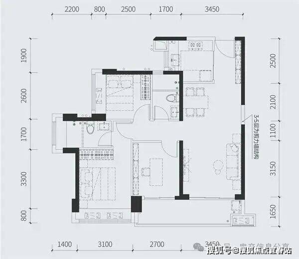 97㎡的3房2厅2卫,设计的竖厅格局,客厅3.45米开间,三开间朝南,3个卧室做到了3.1米/2.7米/2.5米的宽度,客厅连接卧室带6.15米长大阳台,U型厨房,得房率:77.73%(不含赠送),有东南向或西南朝向。